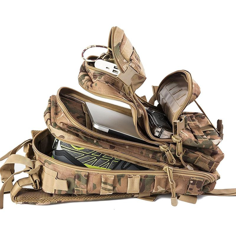 This Tactical backpack has multiple compartments, multiple external pockets, and multiple mesh interior pockets.